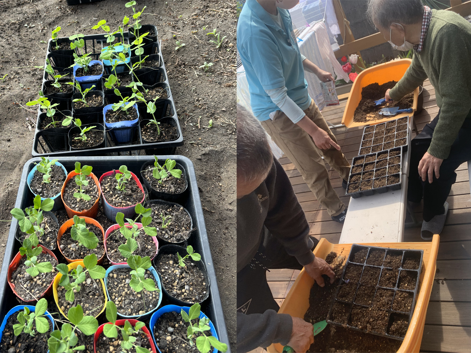 グリーンバンクの補助金を活用し、花の管理も力を入れています。種から苗を作り、苗の植え替えを行うところまで行います。種が発芽し、双葉が育ち、苗箱が小さく感じられたら植え替えです。利用者様等が成長を感じることができるように施設の庭、出入り口にて管理を行います。植え替え先はプランターや花壇となります。開花した花は、切り花として施設のテーブルにて四季を感じてもらうために飾ります。