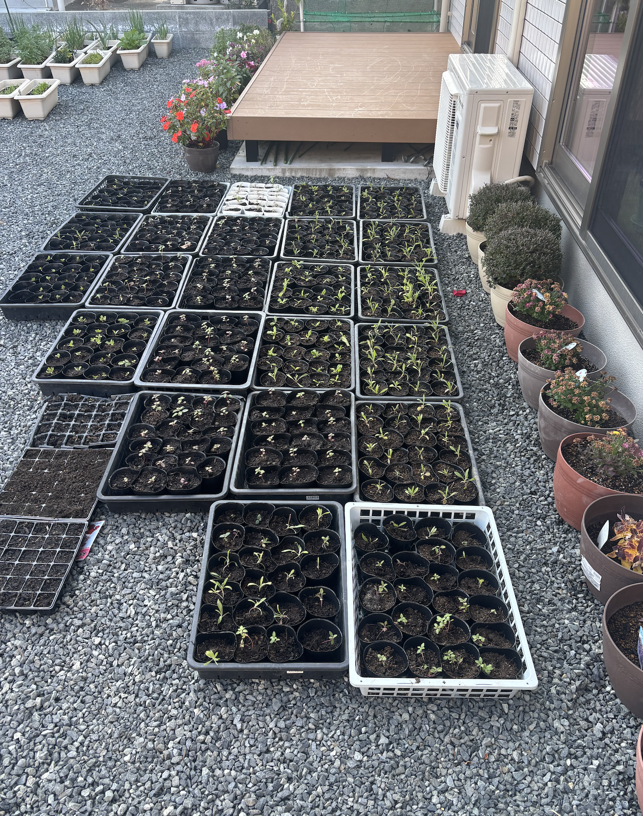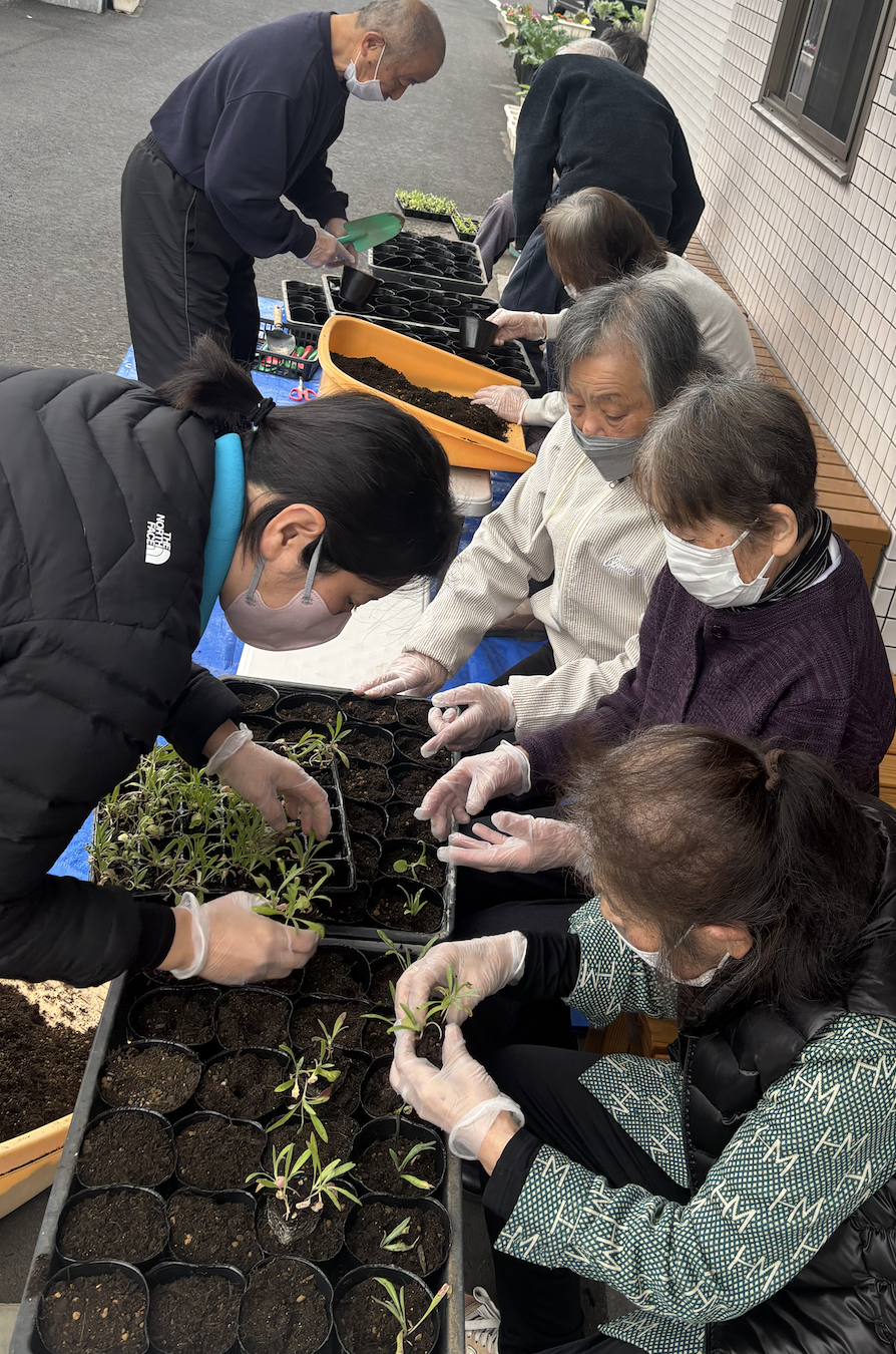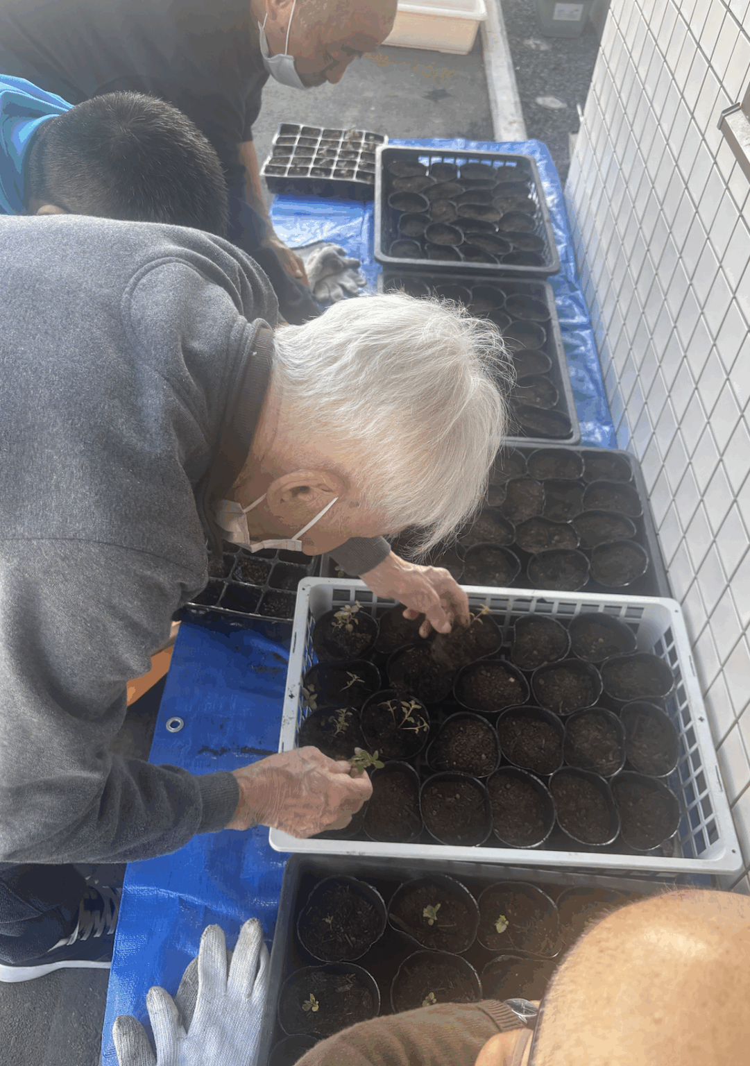 苗箱に小さな種を利用者様に植えてもらった花達が発芽しました。小さなポッドに植え替えて 冬を超える準備を球根の植え付けの合間に続けています。花の苗は、かいがら草、矢車草、ゴディチア、スイートピー。利用者さま達ががんばって作業してくれた苗達、大きくなったらご近所に配ろうと思っています。